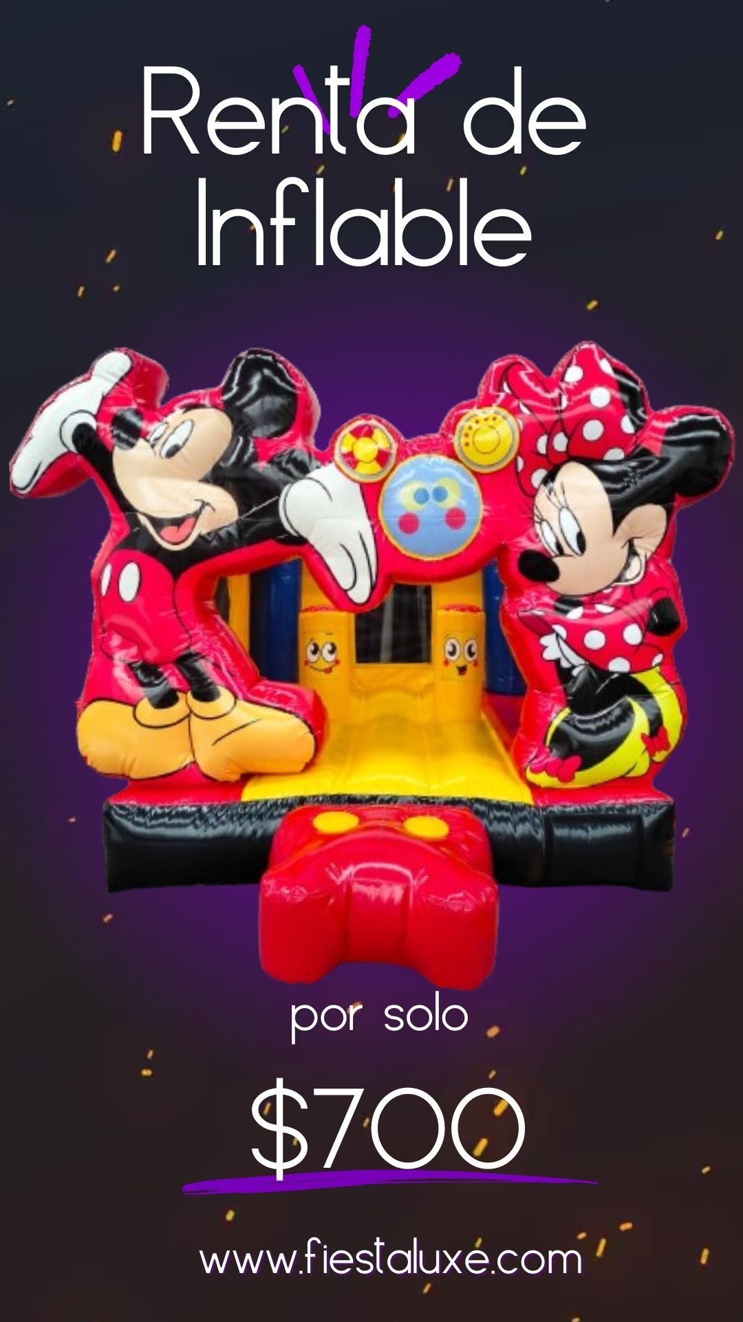🐭 ¡Haz que la fiesta de tus pequeños sea mágica con nuestros inflables temáticos de Mickey Mouse y Minnie Mouse de Fiesta Luxe! 🎉✨